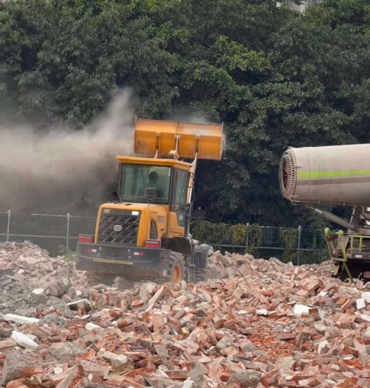 在网传视频中,一台设备对着铲车吹风,铲车掘起的泥土砖瓦,随风扬起漫天沙尘,能见度只有两三米。