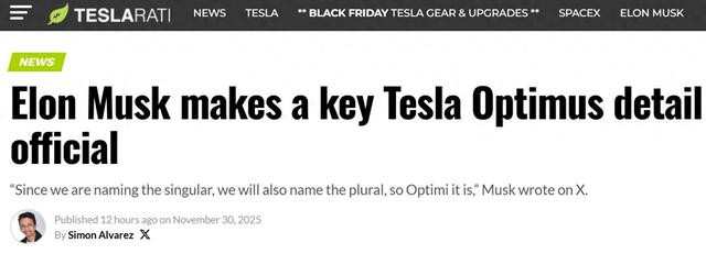 [环球网科技综合报道]12月1日消息,据teslarati报道称,特斯拉首席执行官埃隆·马斯克在社交平台X上正式确认其人形机器人产品Optimus的复数形式为“Optimi”,用于指代多台Optimus机器人。