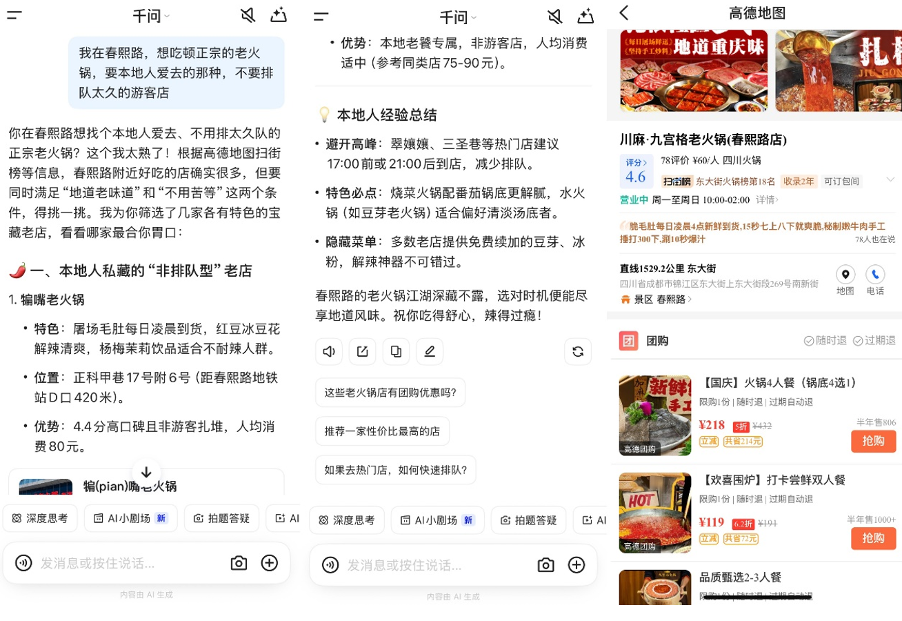 例如,你可以对千问APP说一句大白话:“我在春熙路,想吃顿正宗老火锅,要本地人爱去那种,不要排队太久的游客店。”